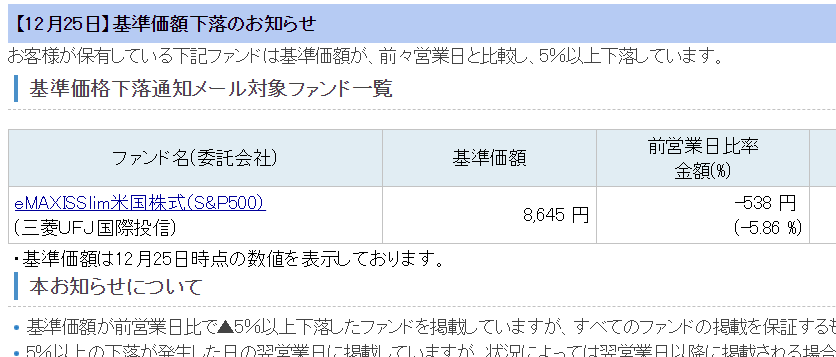自分の保有している投資信託が1日で5%以上のマイナスがあったというお知らせでした。